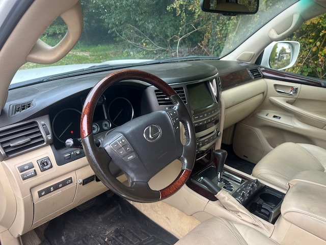 The 2011 Lexus LX 570 is a full-size, body-on-frame luxury SUV that combines rugged capability with high-end comfort and technology. It is powered by a 383-horsepower, 5.7-liter V8 engine and a six-speed automatic transmission, with standard full-time four-wheel drive. The interior features supple leather, genuine wood trim, and amenities like a navigation system and four-zone climate control, while standard safety equipment includes a comprehensive set of airbags and electronic stability control. The LX 570 also has a 8,500-pound towing capacity and features off-road technologies like Crawl Control and Active Height Control.