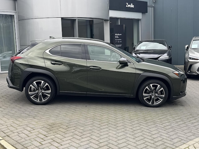 Lexus UX250h Business line in de chique kleur Terrane Khaki metallic met Black tahara interieur. Deze auto is door ons nieuw geleverd in 2023 en ook altijd door ons dealer onderhouden geweest. De auto staat op Michelin All-Season banden.