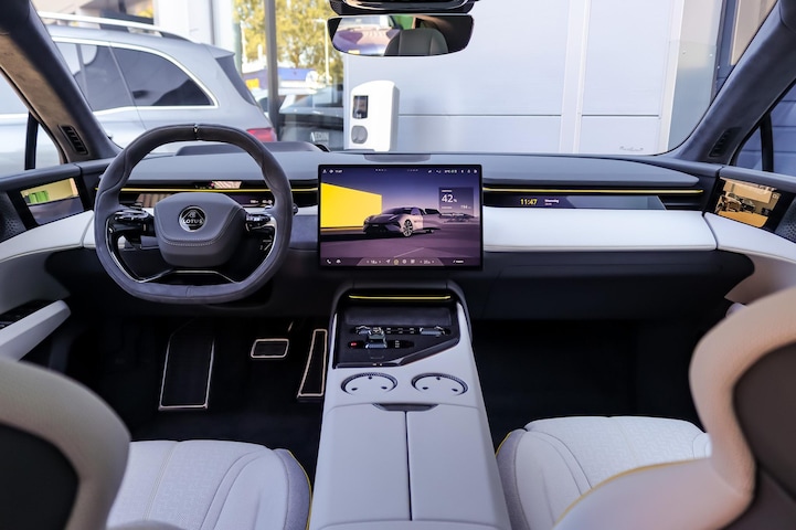 Kijk naar de zelfbewuste vormgeving. Ontdek de vernieuwende technologie aan boord. De Lotus Emeya is een unieke elektrische auto. Ervaar de kracht en stilte van de elektromotor tijdens het rijden. Met de elektrisch bedienbare achterklep kun je handsfree bij de kofferruimte komen. En daarna prinsheerlijk plaatsnemen in het lederen interieur. Ondanks koele temperaturen buiten, blijf je binnen warm met de stoelverwarming met massagefunctie en verwarmbare stuur en achterbank. Neem plaats op de comfortabele stoelen. Dankzij de elektrische bediening en het geheugen is het eenvoudig om hierin de beste zitpositie te vinden. Het panoramadak geeft extra sfeer aan het interieur en biedt een prachtige doorkijk naar buiten. De slimme koplampen gebruiken de allernieuwste matrix LED-verlichting. Altijd maximaal zicht, nooit verblinding bij de tegenligger. Bij de uitrusting van deze Lotus horen onder meer extra getint glas, in delen neerklapbare achterbank en verstelbare lendensteunen.