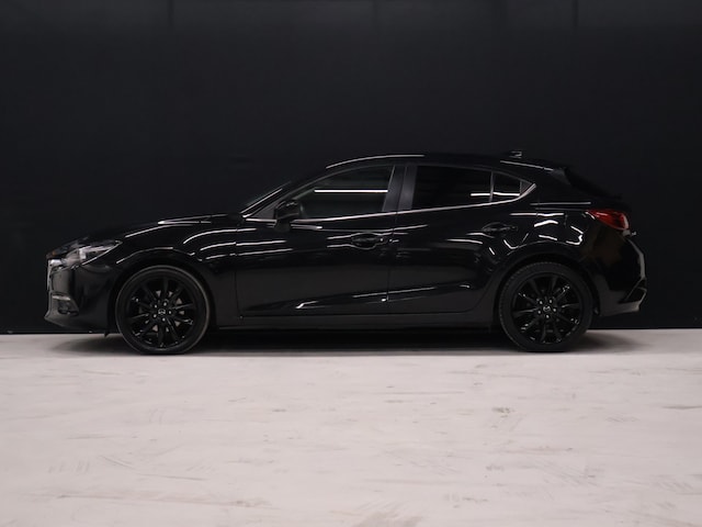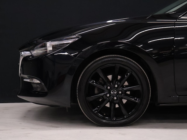 Zoals u mag verwachten van deze Mazda 3 is hij uitgerust met een reeks aan actieve veiligheidssystemen. Verkeersborddetectie herkent tijdelijke en permanente verkeersborden langs en boven de weg. Het Lane-keeping systeem registreert permanent of u binnen de lijnen van de rijstrook blijft; dwaalt u onbedoeld af, dan waarschuwt het systeem en corrigeert de koers. Veel aanrijdingen bestaan uit kop-staartbotsingen. De forward collision warning reduceert dat risico aanzienlijk. Verder is deze auto uitgerust met head-up display, dodehoekdetectie, hill hold functie, brake assist, vermoeidheidsherkenning en bandenspanningcontrolesysteem.