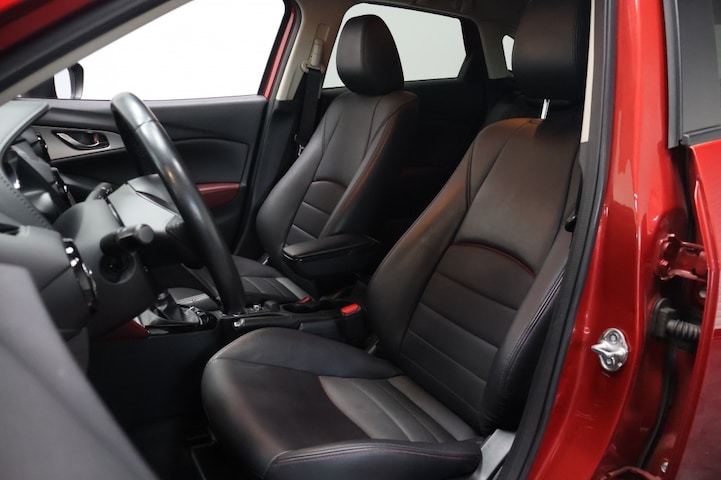 Binnenin de Mazda CX-3 vind je een luxe interieur met lederen/stof bekleding die zowel comfortabel als stijlvol is. De voorstoelen zijn verwarmd, wat ideaal is voor de koudere dagen. Het navigatiesysteem full map zorgt ervoor dat je altijd de juiste route vindt, terwijl de achteruitrijcamera het parkeren een stuk gemakkelijker maakt.