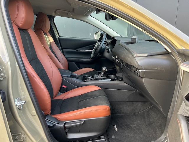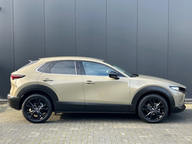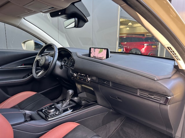 Keurige Mazda CX-30 2.0 Nagisa Automaat voorzien van half lederen interieur, adaptieve cruise control, navigatie full map, head up display, Apple Carplay, Android Auto, achteruitrijcamera, parkeersensoren, BOSE sound, privacy glas, sportvelgen met 4-seizoensbanden en een afneembare trekhaak 1.300kg.
