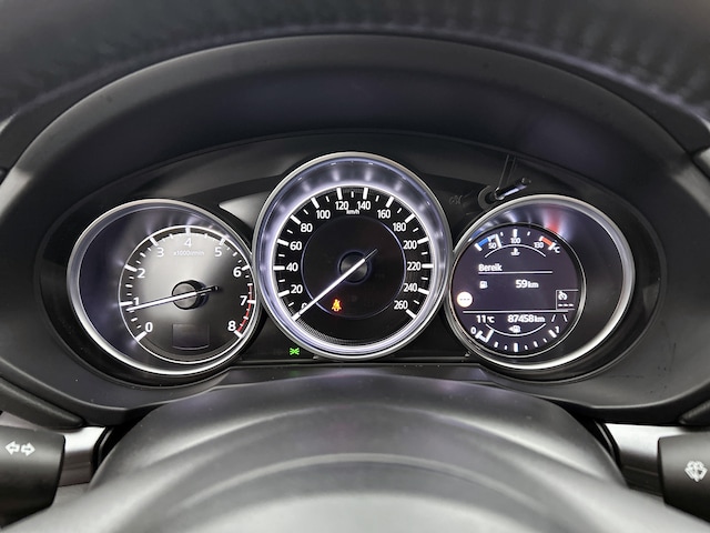 Hij is klaar voor nog jaren rijplezier, deze Mazda CX-5 uit 2020. Er staat 87458 kilometer op de teller. De aandrijving komt voor rekening van een benzinemotor en een handgeschakelde zesversnellingsbak. Stijl en comfort krijgt u erbij in de vorm van een fraai lederen interieur. 's Winters op pad gaan kan een behoorlijke uitdaging zijn. Daarom is deze Mazda CX-5 voorzien van weldadige verwarmbare voorstoelen. De bagageruimte is toegankelijk via een comfortverhogende elektrische achterklep. In deze Mazda profiteer jij onder andere ook van: 19 inch lichtmetalen velgen, LED koplampen, dakspoiler, donker getint glas achter, in delen neerklapbare achterbank en LED-achterlichten.