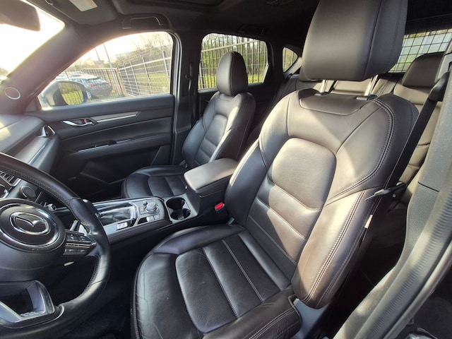 Van uw nieuwe auto verlangt u rijplezier, maar ook optimaal comfort en veiligheid. Daarom is de Mazda CX-5 de auto die u zoekt. De aandrijving komt voor rekening van een benzinemotor en een automatische transmissie. Dak dicht? Dan toch volop daglicht door het elektrisch bediende glazen panorama dak. Het lederen interieur ademt luxe en de elektrisch bedienbare achterklep biedt volop gemak. Voorin is het 's winters genieten met de verwarmbare voorstoelen voor zowel bestuurder als bijrijder. Als het buiten koud wordt, voelt zo'n verwarmd stuurwiel heerlijk aan. Ook 19 inch lichtmetalen velgen, LED koplampen, dakspoiler, extra getint glas, in delen neerklapbare achterbank en LED-achterlichten horen tot de voorzieningen op deze auto. Het digitale dashboard is niet alleen enorm fraai en handig, maar draagt actief bij aan een veilige en slimme rit. De vier camera's genereren samen een 360 graden beeld rond de auto, zodat u een volledig overzicht hebt van wat er rondom uw auto gebeurt. Met adaptive cruise control houdt de auto zelfstandig afstand tot uw voorligger. Een veiligheidsverhogende optie waarmee u comfortabel onderweg bent. Hoog, laag, midrange: het high performance audiosysteem is volledig afgestemd op de akoestiek in deze auto. De kans op een kop-staart botsing wordt sterk gereduceerd door het systeem van achteropkomend verkeer waarschuwing. En dan is deze auto ook nog eens voorzien van dashboard met spraakbediening, full map navigatiesysteem, electronic climate control, DAB ontvangst, regensensor en keyless entry. Zoals u mag verwachten van deze Mazda CX-5 is hij uitgerust met een reeks aan actieve veiligheidssystemen. In het instrumentarium ziet u tijdens de rit ook de belangrijkste verkeersborden aangegeven, die de auto automatisch voor u leest. Het Lane-keeping systeem registreert permanent of u binnen de lijnen van de rijstrook blijft; dwaalt u onbedoeld af, dan waarschuwt het systeem en corrigeert de koers. Veel aanrijdingen bestaan uit kop-staartbotsingen. De forward collision warning reduceert dat risico aanzienlijk. Ook helpen het head-up display, dodehoekdetectie, hill hold functie, brake assist, vermoeidheidsherkenning en bandenspanningcontrolesysteem, uw rit tot een veilige rit te maken. Neem contact op en we regelen een afspraak!