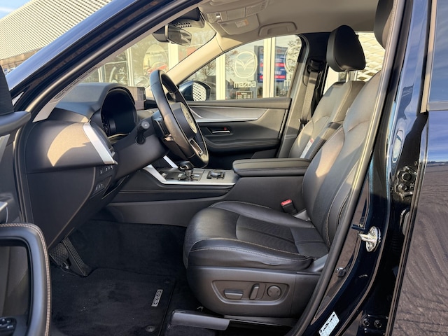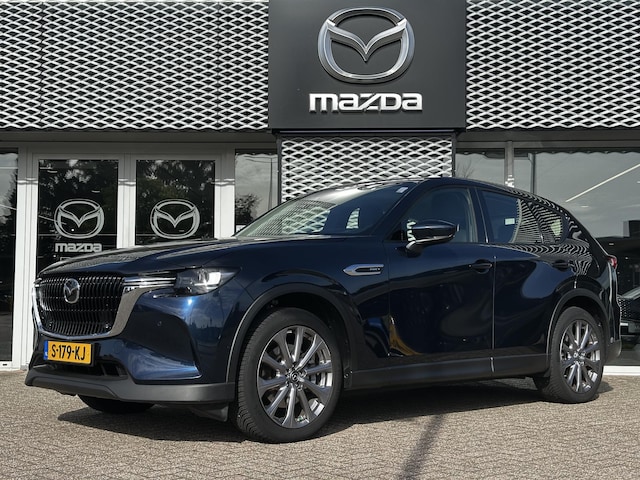 Deze Mazda CX-60 in de kleur Deep Crystal Blue is voorzien van O.A. stuurverwarming, stoelverwarming. Apple/Android carplay, head up display, climate control, adoptieve cruise control, licht en regen sensoren, keyless entry en keyless starten en parkeer sensoren voor en achter.