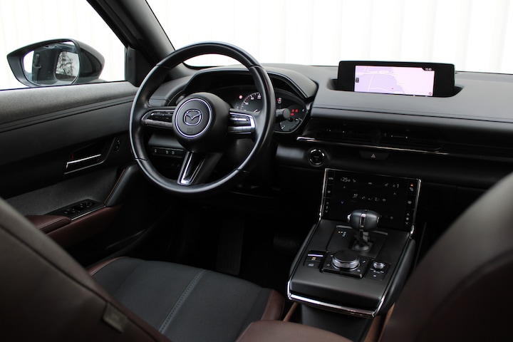 Wat ook opvalt, is de strakke en overzichtelijke informatie die het digitale dashboard levert. Kommaar-kommaar-kommaar, aldus de achteruitrijcamera. Iedere centimeter vrije ruimte komt haarscherp in beeld. Schadevrij inparkeren maar! Met adaptive cruise control houdt de auto zelfstandig afstand tot uw voorligger. Een veiligheidsverhogende optie waarmee u comfortabel onderweg bent. Uw smartphone is tegenwoordig de sleutel tot heel veel. Ook voor deze auto. Remote services, noemen we dat. Waar u ook bent, contact houden is een eitje. In deze MX-30 vindt u schakelaars op het stuur om het navigatiesysteem te bedienen en het audio-installatiesysteem met DAB-ontvangst. De Mazda is standaard voorzien van: kruisend verkeer detectie, automatische airconditioning, regensensor, automatisch dimmende binnenspiegel, isofix-aansluiting en centrale deurvergrendeling met afstandsbediening.