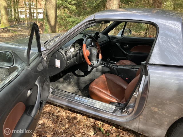 De MX-5 heeft haar Titanium Grey metallic lak gecombineerd met een bruin lederen interieur en is goed onderhouden.