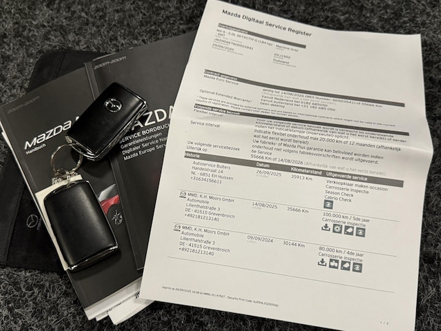 Prachtig uitgevoerde Mazda MX-5 2.0 184pk in Signature uitvoering die zich kenmerkt door zijn bruin/rode geperforeerd Nappa lederen interieur. Voorzien van achterruitrijcamera, CarPlay, navigatie af fabriek, Bose audio, led verlichting, cruisecontrol, dodehoekdetectie en verkeersbord herkenning enz. Volledig dealeronderhouden door zijn vorige 1e eigenaresse, laatste onderhoudsbeurt dateert van 08-2025 bij 35.666km.
