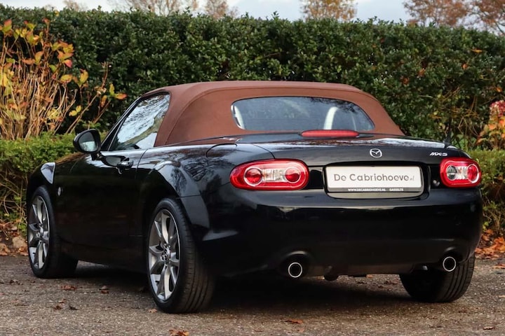 Deze prachtige Mazda MX-5 NC 1.8l in Stralend Zwart Doorzichtig combineert sportiviteit met een stijlvolle uitstraling. De auto valt direct op door zijn bruine lederen bekleding, bijpassende lederen deurpanelen en de bijbehorende bruine stoffen softtop met verwarmbare glazen achterruit.