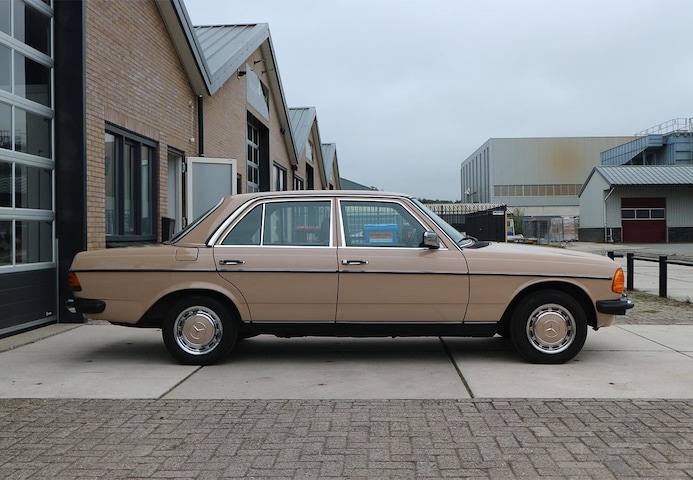 Zeer fraaie, gekoesterde W123 200 van augustus 1983, in zandbeige met zwart stof interieur.