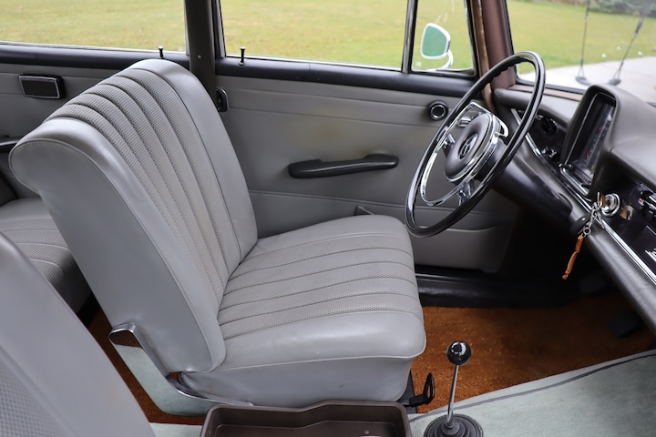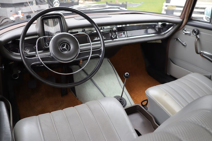 Het interieur bestaat uit met lichtgrijs Mercedes-Benz Tex beklede banken en hemelbekleding in goede staat. Binnenin de auto waant u zich in ultieme klasse en statigheid. Bijzonder en optioneel is de handgeschakelde vloer-versnellingsbak. Het imposante grote stuurwiel nodigt uit om te rijden. Het dashboard is zwart en beschikt onder meer over een klokje en bediening van de verwarming. De staat van het interieur is goed en origineel. Ook de achterbank is onbeschadigd en deze beschikt over een uitklapbare middenarmsteun. Onder de voorstoel bevindt zich een brandblusser. De originele gereedsschapset en krik zijn aanwezig. De kofferruimte is netjes en biedt plaats aan het reservewiel.