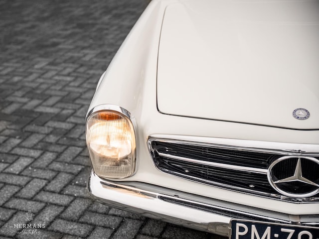 In 2018 volledig opnieuw gespoten en gedeeltelijk gerestaureerd. De softtop is toen ook vervangen. Bij dit exemplaar zijn ook de karakteristieke inhammen rondom de koplampen zoals ze oorspronkelijk vanuit de fabriek bedoeld zijn. Dat detail lijkt klein, maar is voor kenners herkenbaar als teken van vakmanschap en een zorgvuldigheid. Het bevestigt dat deze Pagode niet zomaar is behandeld, maar met kennis van zaken en oog voor originaliteit is behouden.