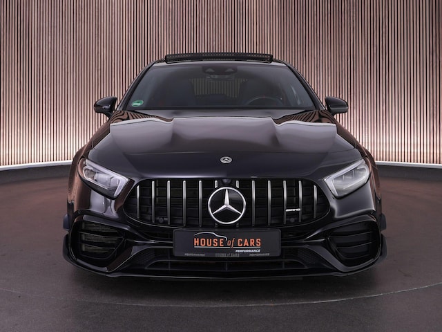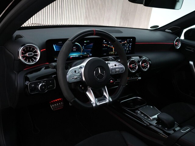 Deze A45 S is uitgevoerd in de stijlvolle kleur Cosmos Black metallic, voorzien van het AMG Nightpakket en het Aerodynamics Package voor een extra sportieve uitstraling. Binnenin vind je rode veiligheidsgordels, AMG Performance-stoelen, sfeerverlichting en het Premium Sound System. Met opties als panoramadak, draadloos opladen, Augmented Reality navigatie en het uitgebreide rijassistentiepakket combineert deze hot hatch pure prestaties met dagelijks comfort.
