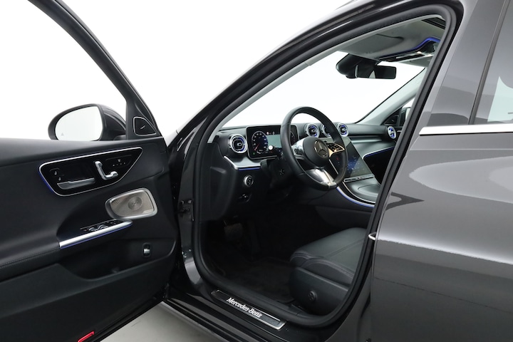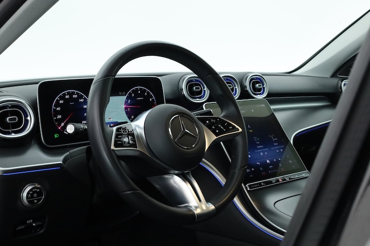 Mercedes-Benz C-klasse Estate 180 Luxury Line voorzien van o.a. panoramadak, elektrische trekhaak, elektrische stoelen met geheugen, stoelverwarming, lederen bekleding, 360 graden camera, Burmester audio systeem, adaptieve cruise control, navigatiesysteem, Apple CarPlay en Android Auto, dodehoek detectie etc.