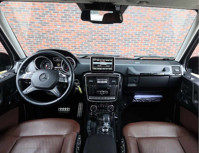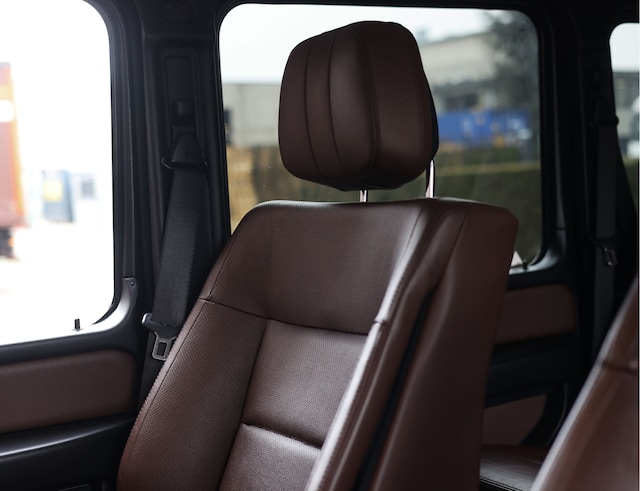 Binnen in de G-Klasse valt direct de warme Chestnut lederen bekleding op, samen met de verwarmbare en geventileerde comfortstoelen en stoelverwarming achter, terwijl het Harman Kardon audiosysteem zorgt voor een fijn geluid tijdens elke rit.