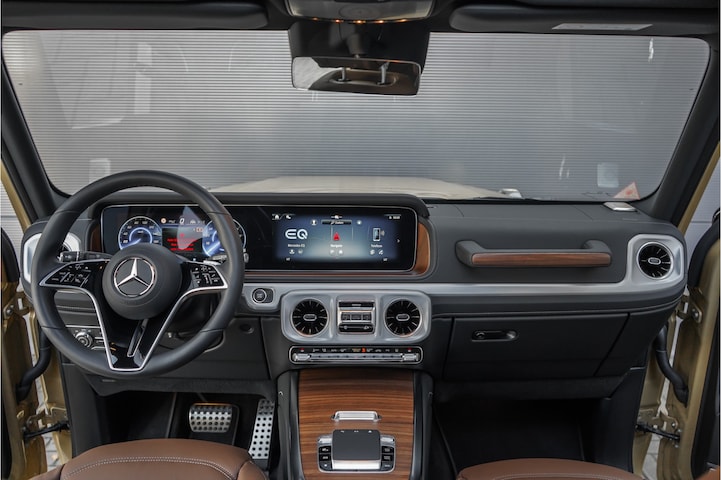 Autobedrijf Schouten biedt u deze prachtige en unieke Mercedes-Benz G-Klasse 580 EQ 116 kWh, volledig elektrisch rijden in een G-Klasse! Het is een unieke verschijning om te zien, mede omdat deze EQG een echt reservewiel heeft op de kofferklep. Dit maakt dat die afgezien van het geluid, niet te onderscheiden is van een normale G-Klasse. Het exterieur van de G-Klasse 580 is uitgevoerd in de prachtige Mercedes Manifaktur Lack: 'Wuestensand', gecombineerd met een zwart dak en een bruin vol lederen interieur. Verder beschikt de Mercedes-Benz G-Klasse 580 EQ 116 kWh over een flinke optieslijst. Denk hierbij aan fabrieksopties zoals: