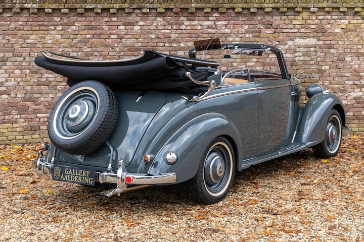 De Mercedes-Benz 170 S Cabriolet B zal voor kenners van klassieke automobielen geen onbekende verschijning zijn, maar laten we eerlijk zijn: waar kom je ze vandaag nog tegen in een staat als deze? Zo nu en dan duikt er een Cabriolet uit deze periode op, maar een uitvoering die volledig, zorgvuldig en met zoveel toewijding is gerestaureerd? Deze prachtige Mercedes-Benz uit 1950, uitgevoerd in stijlvol grafietgrijs met beige leren bekleding en prachtig donkerbruin houtwerk, behoort onmiskenbaar tot die zeldzame categorie.