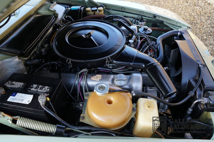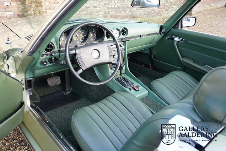 Bestel toch eens een kleurtje! Dat moet de eerste eigenaar van deze schitterend samengestelde R107-generatie Mercedes-Benz 450SL hebben gedacht. Wat een heerlijke combinatie van kleuren. De samenstelling bestaat uit een “Thristle Green” exterieur en een met groene tapijten, een lichtgroen dashboard en groene lederen bekleding. Het is werkelijk een schitterende combinatie. De kleur wordt versterkt door de zwarte cabrioletkap. Het betreft hier een auto uit 1973 die nog is voorzien van de fraaie klassieke bumpers, het jaar erop werden de bumpers maar liefst 8 centimeter langer om te voldoen aan de strenger geworden eisen voor botsveiligheid. Dat deze Mercerdes-Benz nieuw is geleverd in de Verenigde Staten is niet zo verwonderlijk. Maar liefst twee derde van de volledige productie werd in de VS verkocht. Ten tijde van de R107 werd de SL zelfs omschreven met de meest heerlijke Amerikaanse omschrijving ooit. Het was een “personal luxury car”, geen idee wat zulks precies inhoudt maar er hangt wel een zweem van succes omheen.