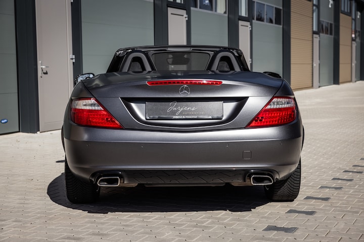 De SLK is origineel geleverd in de zwart kleur – Obsidian Black. In dit geval is de auto gewrapt in de donkergrijze satijn wrap Tenorite Grau. Dit geeft hem een unieke sportieve en luxe uitstraling en het combineert prachtig met het zwarte interieur. Mooie details zijn de 5-spaaks originele lichtmetalen velgen en de LED dagrijverlichting.