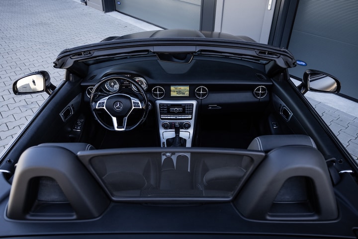 Deze SLK is ontzettend luxe samengesteld. Zo zetel je op stoelen met lederen bekleding en uiteraard zijn deze voorzien van stoelverwarming. Heel fijn is het Airscarf systeem waarbij de hoofdruimte verwarmd wordt middels warme lucht uit de bovenzijde van de stoelen. Het winscherm zorgt er voor dat er nauwelijks luchtwervelingen in het interieur zijn. De SLK is verder voorzien van automatisch geregelde airconditioning, het originele Mercedes-Benz audiosysteem met stuurwielbediening en multimedia met bluetooth audiostreaming, navigatiesysteem en bluetooth telefonie. Rondom zijn er parkeersensoren en uiteraard is de SLk voorzien van cruise control.