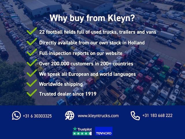 Waarom u bij KLEYN koopt? Die keus is simpel: 1200 Gebruikte vrachtwagens, trekkers, opleggers en aanhangers op 1 locatie met alle merken. Op onze trucks tot 700.000 kilometer en 7 jaar is tot 1 jaar garantie mogelijk inclusief afleverbeurt. In ons adviesgesprek zoeken we samen de best passende financiering.