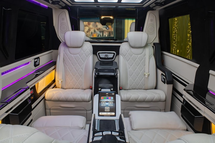 Vier Mercedes-Captain-Chairs, davon zwei mit Beinauflage, laden zum ultimativen Komfort ein. Sitzheizung, Belüftung und drei Massageprogramme sorgen dafür, dass jede Fahrt entspannend wird. Elektrisch ausfahrbare Tische, eine Nespresso-Bar und eine Whiskybar machen den Innenraum modular und funktional – alles vom Sitz oder per iPad steuerbar.