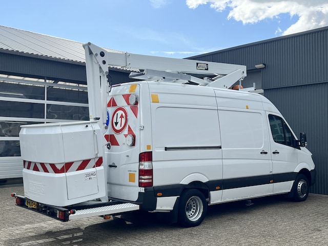 Een zeer nette Mercedes Sprinter 516 160pk Hoogwerker 14 meter Pto Omvormer Verkeersbord Bedieningspaneel Kastinrichting Airco Cruise control Tachograaf Steunpoten Telefoonverbinding Euro 6