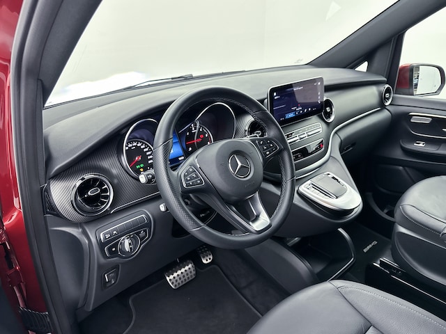 Deze V-Klasse is uitgevoerd in stijlvol donkerrood metallic en voorzien van het AMG Styling-pakket, inclusief 19-inch lichtmetalen velgen en sportieve styling, wat zorgt voor een dynamische uitstraling.