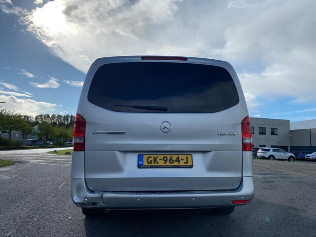Deze Mercedes-Benz Vito Tourer komt uit 2015, werd geleverd van 01-09-2014 tot 30-09-2015 en kostte toen € 59.838,-. Deze originele Nederlandse personenauto staat sinds 2015 op kenteken, is voorzien van een diesel-motor, heeft een maximum vermogen van 120 kW (163 PK) en een cilinderinhoud van 2143 cc.