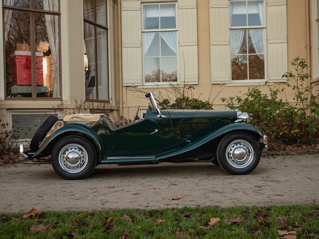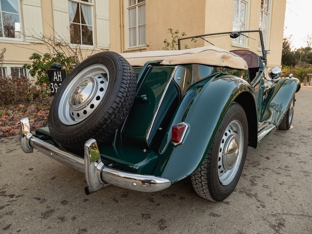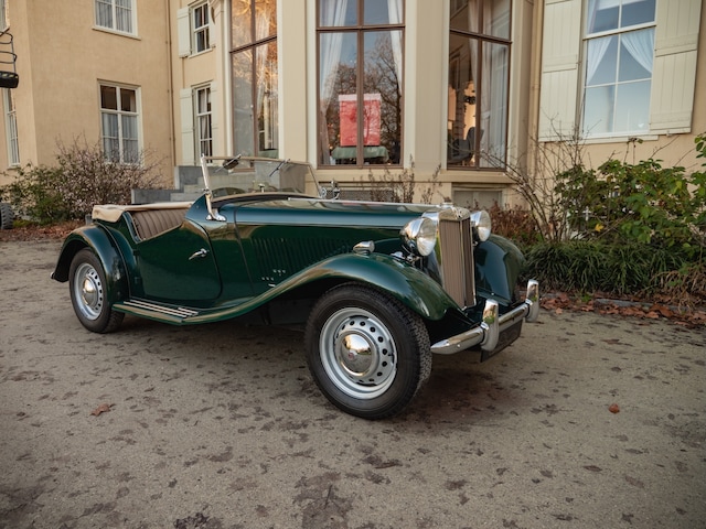 Het exterieur is uitgevoerd in het iconische British Racing Green, een kleur die perfect past bij de sportieve maar elegante lijnen van de MG TD.
