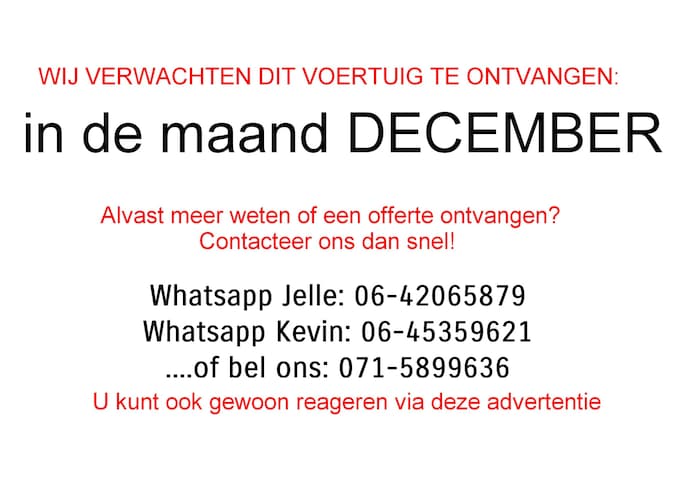 LET OP! Deze auto is nog niet aanwezig. Wij verwachten dit voertuig eind december binnen te krijgen. Wilt u niet te laat zijn en alvast contact met ons over de auto? Stuur ons dan een bericht! We helpen u graag verder.