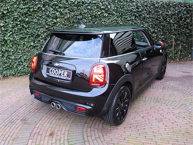Leuke Mini Cooper S 2.0 Chili F56 in de kleur Midnight Black metallic met JCW spiegelkappen, Black Line pakket, zwarte 17" Cosmos Spoke velgen en een half leder Diamond Carbon Black sportinterieur met stoelverwarming, Carbon Black Colour Line en bijpassende Piano Black interieurdelen. Deze Mini is o.a. uitgerust met een Driver Assistance Pack (autonomous emergency braking, cruise control adaptief met stop&go, bots waarschuwing systeem, grootlichtassistent, verkeersbord detectie), climate control, LED-koplampen en mistlampen, Union Jack achterlichten, Hifi-systeem Harman Kardon, navigatie, Apple Carplay, Head-up Display, draadloze telefoonlader en een opberg- en lichtpakket.