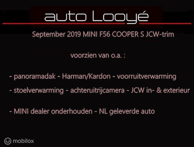 63 (scherpe) foto's op onze website ! Zoals het hoort, dat is deze luxe uitgevoerde, NL-geleverde MINI F56 JCW-trim Cooper S automaat, met een ook wel weer een hele volle optielijst !