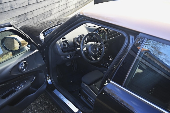 De Clubman is uitgevoerd in Midnight Black Metallic, gecombineerd met een sportief en stijlvol Double Stripe interieur in Carbon Black. De donkere kleurstelling geeft de auto een krachtige en tijdloze uitstraling, perfect passend bij het Cooper S-karakter.