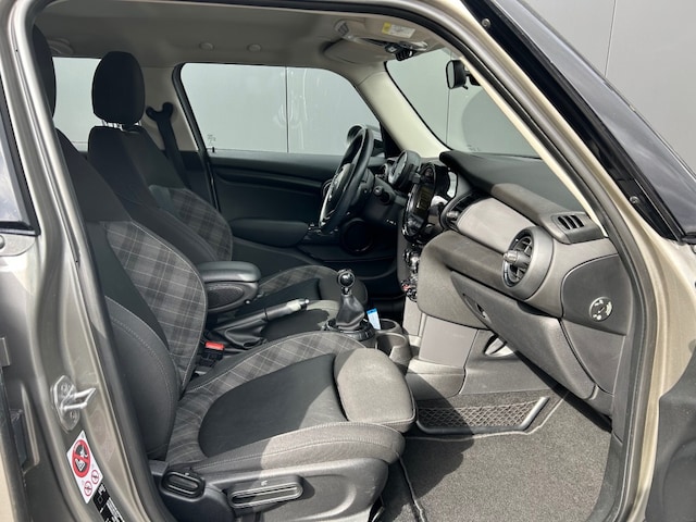 Sportieve Mini Cooper 1.5 Chili 5-Drs voorzien van half lederen sportstoelen incl. stoelverwarming, navigatie full map, cruise control, LED verlichting, parkeersensoren, lichtpakket en sportvelgen.