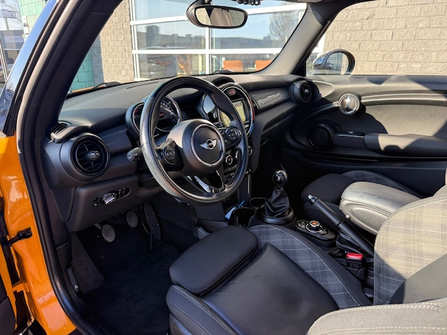 De Mini is uitgevoerd in een opvallende oranje kleur met zwarte accenten, waaronder de sportieve racestrepen over de motorkap. Binnenin vind je half lederen sportstoelen die zorgen voor extra comfort en een sportieve uitstraling.