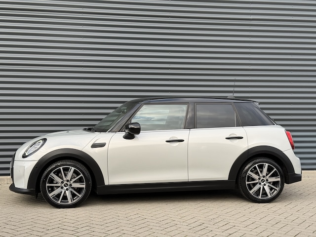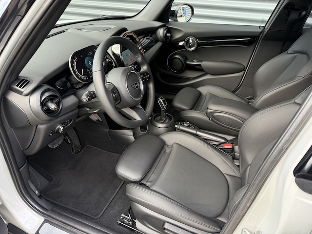 Schitterende Mini 5-deurs Coopers automaat in White Silver metallic met Black Optic pakket en 17 inch lichtmetalen velgen. De Mini is voorzien van veel mooie opties zoals: Lederen bekleding, sport-comfort stoelen, Navigatie, Apple Carplay, stoelverwarming, parkeersensoren, keyless entry and start, cruise control, virtuele cockpit, LED sfeer interieur verlichting, etc..