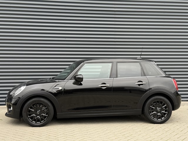 Schitterende Mini 5-deurs automaat in Midnight Black metallic met hoogglans zwarte licht metalen velgen, stoelverwarming, airco, bluetooth telefoon met audiostreaming, parkeersensoren, etc..