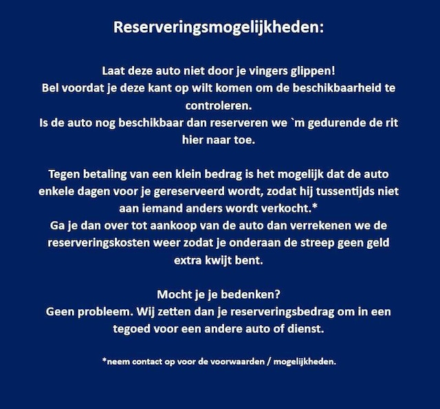 Wij vragen Uw begrip dat wij geen auto's kunnen reserveren. Neem voordat U vertrekt contact met ons op, om er zeker van te zijn dat de auto van uw keuze nog beschikbaar is. Rekening houdend met uw reistijd houden wij dan de auto voor U vast.