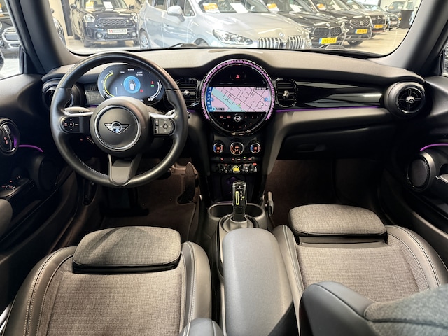 Schitterende Mini Electric in Moonwalk Grey metallic met hoogglans zwarte licht metalen velgen en Black Optic pakket. De Mini is voorzien van mooie opties zoals: Apple Carplay. navigatie, half lederen sport-comfort stoelen, climate control, parkeersensoren, cruise control, zwarte hemelbekleding, etc..