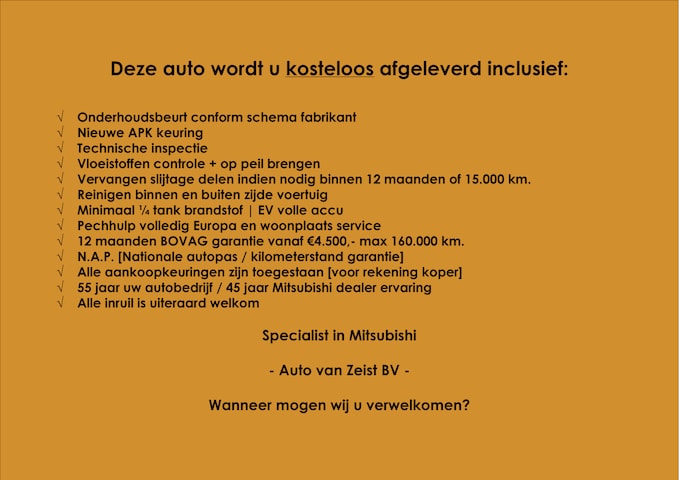 Wij streven naar persoonlijke service en kwaliteit voor een transparante prijs, hierdoor hanteren wij all in rijklaar prijzen en leveren wij elke occasion kosteloos af met onderstaand afleverpakket: