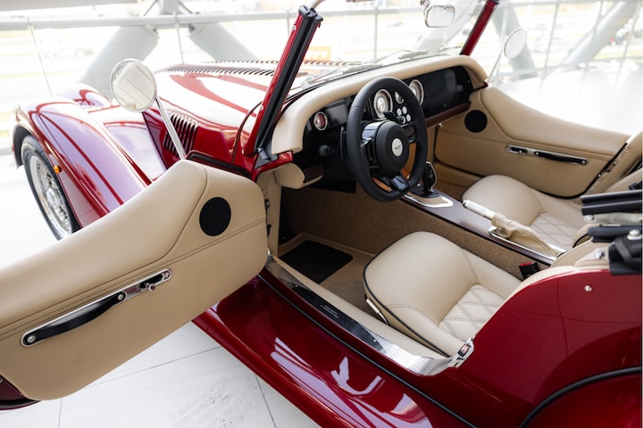 De Mohair soft top hoort bij de beleving van deze auto. Open rijden is waar het om draait. Op een zonnige dag, maar ook wanneer het wat frisser is, blijft het gevoel hetzelfde. Je zit dicht op de auto en merkt alles wat er gebeurt. Dat maakt elke rit anders, ongeacht de afstand. Binnenin is gekozen voor een warm interieur in de kleur Morgan Biscuit. Dit geeft een mooi contrast met het rode exterieur en zorgt voor een klassieke sfeer. De afwerking is zoals je verwacht bij Morgan: leer, hout en metalen details die je echt voelt. De stoelen zijn voorzien van verwarming, waardoor ook rijden op koelere dagen comfortabel blijft.