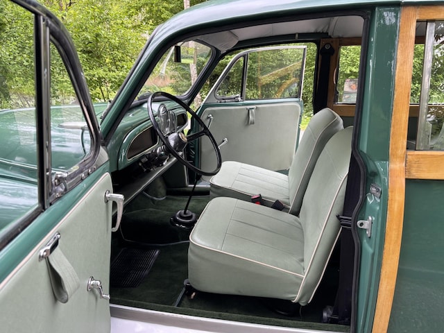 De Traveller is tijdens de restauratie overgespoten in de originele kleur “Almond Green" en de lak ziet er strak uit met enkele schoonheidsfoutjes. De buitenzijde ziet er gewoon mooi uit en de kleur is geweldig. Almond Green is nu een zeer geliefde Morris kleur, kijk maar naar de klassieke Mini. Ook het bekende essenhouten frame is compleet vernieuwd en gelakt net als de chromen bumpers. Er zijn toen nieuwe velgen met nieuwe banden gemonteerd met de mooie wieldoppen.