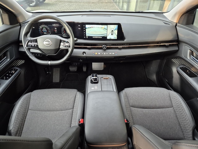 Het digitale dashboard is een perfecte bijrijder. Alles benodigde informatie is permanent zichtbaar of opvraagbaar. Met de 360 graden camera, verzorgd door vier camera's, wordt rijden in drukke steden of het navigeren in nauwe ruimtes een koud kunstje. Adaptive cruise control is een comfortabele en veilige optie. Het systeem reguleert de snelheid en houdt automatisch afstand tot uw voorligger. Rijden-stilstaan, rijden-stilstaan. Niks is irritanter en vermoeiender dan filerijden. Daar heeft deze Nissan Ariya een oplossing voor: de file assistent, die met radarmeting permanent het tempo aanpast op de voorligger. Zelfs als die stopt. Locatie, motorconditie, storingen... via Connected Services krijgt u alle vitale info over de auto door. Ook handig bij pech! Ook dashboard met spraakbediening, full map navigatiesysteem, automatische airconditioning, draadloos opladen, DAB ontvangst en regensensor zijn aan boord.