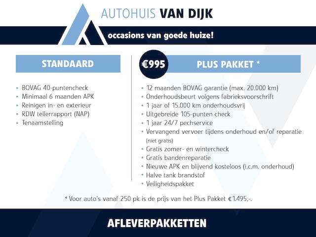 Inbegrepen afleverpakket: Occasion Standaard Pakket: Onze occasion prijzen zijn rijklaar inclusief het Occasion Standaard Pakket met: • BOVAG 40-puntencheck • Minimaal 6 maanden APK • Reinigen in- & exterieur • RDW tellerrapport (NAP) • Tenaamstelling