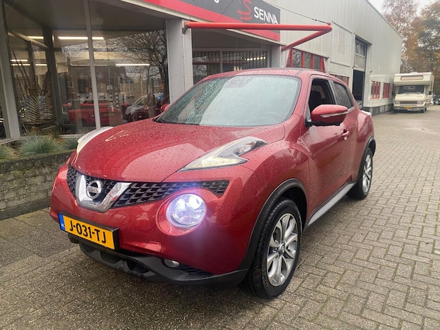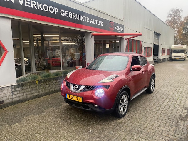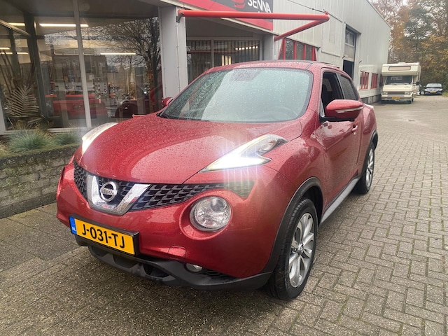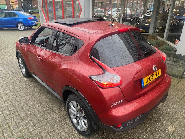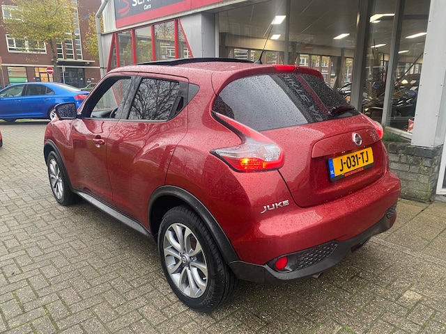 Zeer nette en goed rijdende NISSAN JUKE 1.2 Edition - Facelift model - Rood metallic - Led verlichting - Privacyglas - Achteruitrijcamera - Panorama dak - Navigatie - Keyless Go - Elektrisch pakket - Rode accenten interieur - 360 Camera - Recent 4 banden vervangen - Ketting vervangen bij 131.xxx km - Enz enz ......