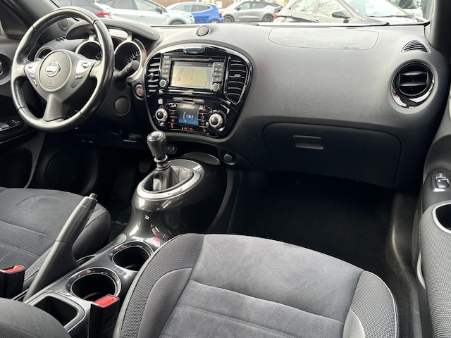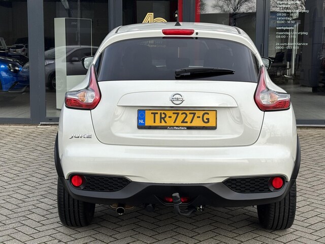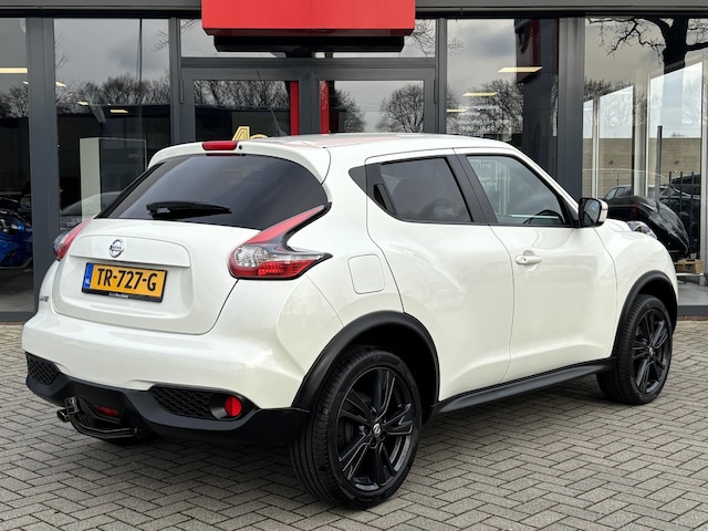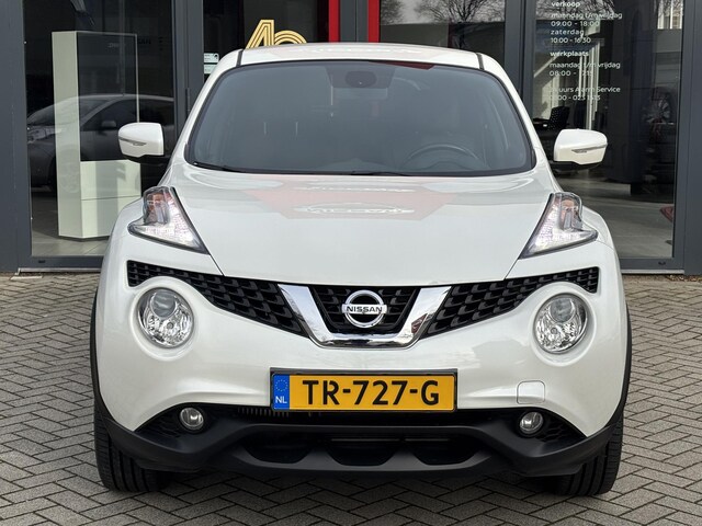 Deze Nissan Juke is volledig dealer onderhouden en origineel Nederlands geleverd, afkomstig van de eerste eigenaar. O.a. uitgerust met automatische airco, climate control, cruise control, navigatiesysteem, achteruitrijcamera, afneembare trekhaak, 18 inch lichtmetalen velgen 'Tokyo Black', interieur pakket in het zwart, parkeersensoren, etc. Inruil en financiering mogelijk!