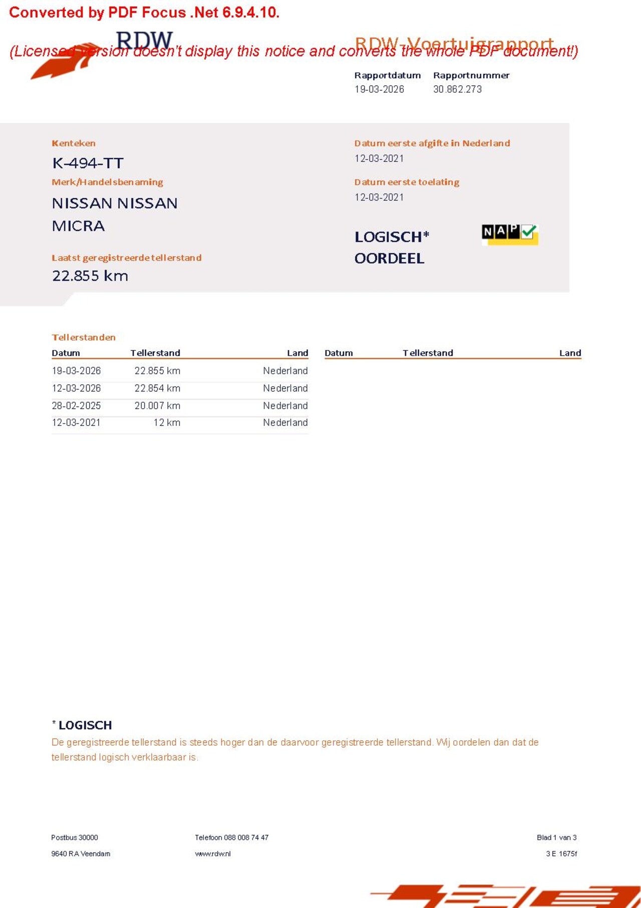 | Kilometerstand | 22.855 km |