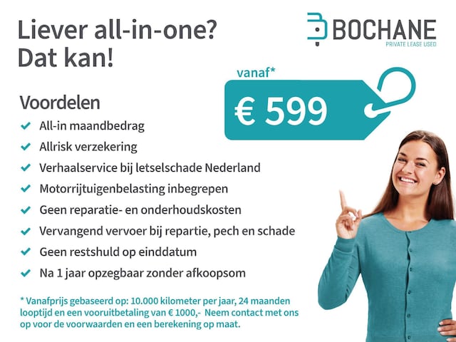 Leaseprijs: private lease € 544 p/m (48 maanden, 10.000 km); full operational lease € 519 p/m (48 maanden, 10.000 km); informeer naar de mogelijkheden en voorwaarden