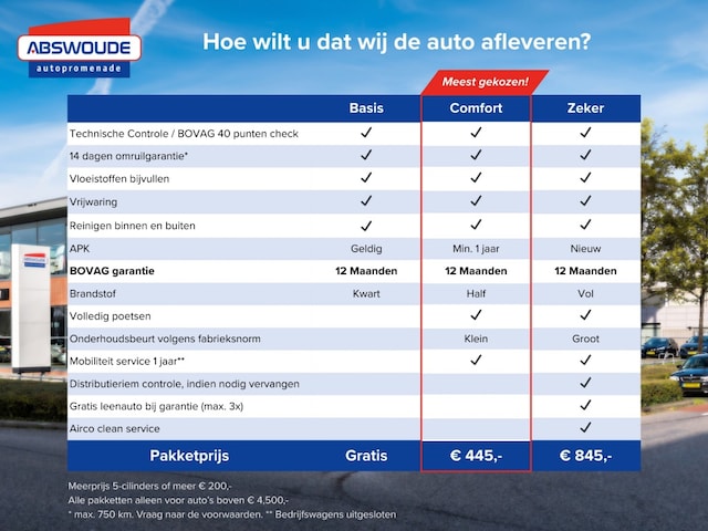 Hoe wilt u dat wij uw auto afleveren? U heeft keuze uit 3 afleverpakketten. Getoonde prijs is inclusief het Basis pakket. ***Kijk voor onze aanbiedingen op www.abswoude.nl ***